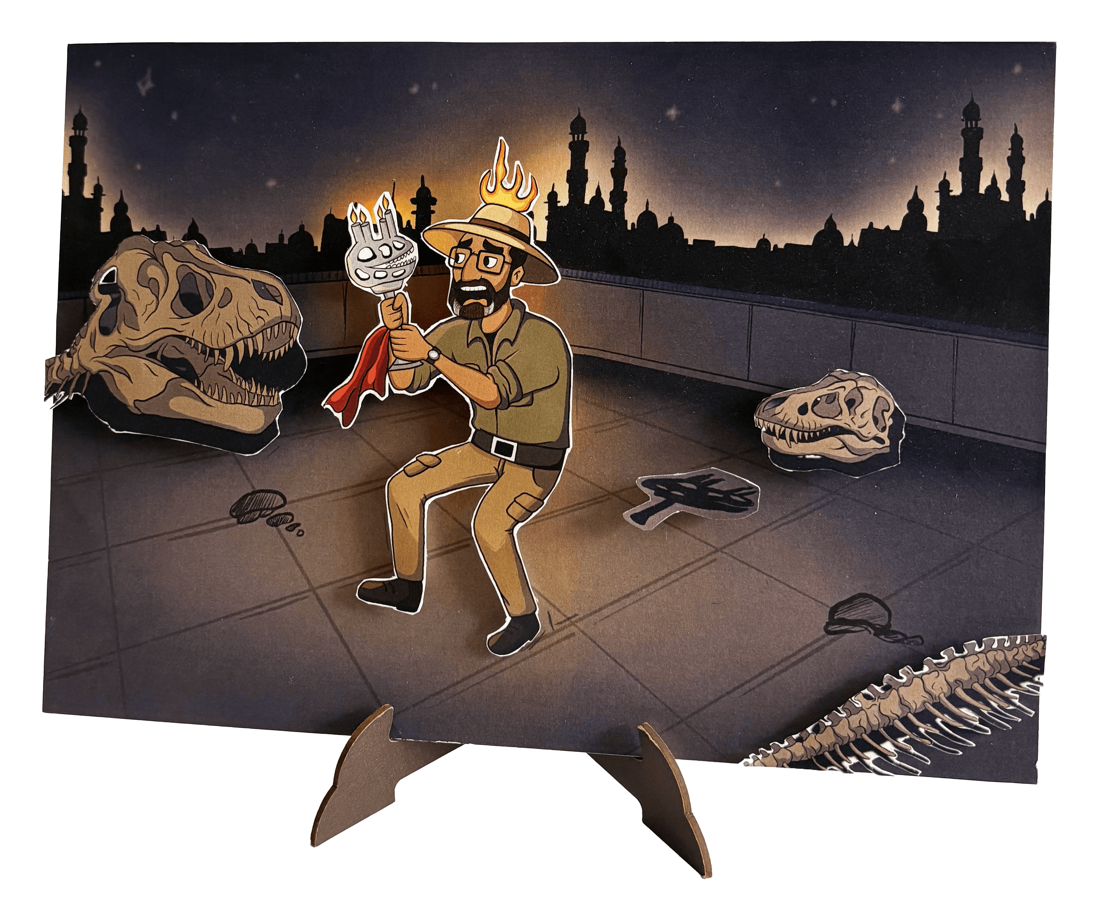 Venky, a Hyderabadi paleontologist afraid of the dark, on a rooftop with a candlestick.